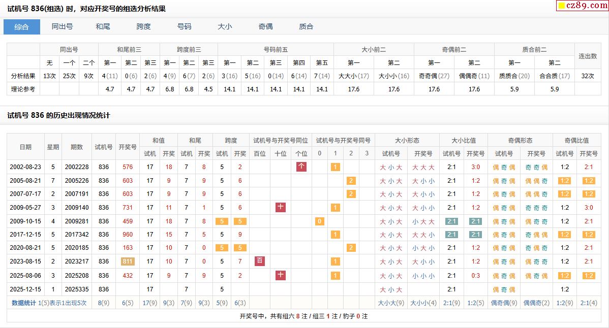> 335期福彩3D试机号836对应开奖号的组选分析结果